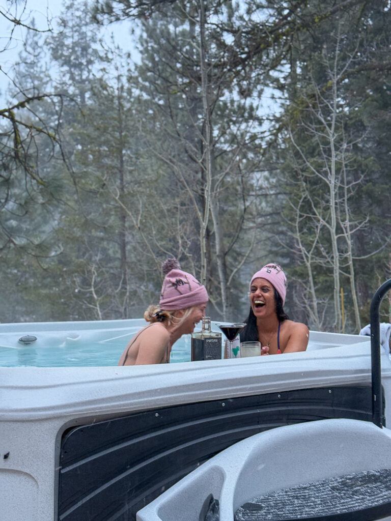 You know those ski cabins in Hallmark movies? The ones with twinkling lights, rustic wood beams, and a hot tub perfectly positioned for dramatic life epiphanies? That’s where we stayed. The Ski Retreat’s Tahoe base was an adorable house that felt both luxurious and cozy, with rooming options to suit all budgets. Whether you wanted a private room to zen out or didn’t mind sharing bunk beds with new besties, there was a space for you.