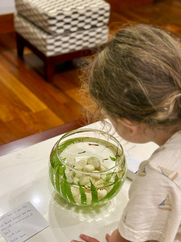 It even had two bathrooms and two refrigerators – one for wine and one for other drinks, as well as a coffee bar. We had our own butler as well, who left a little bowl of koi fish for our son!