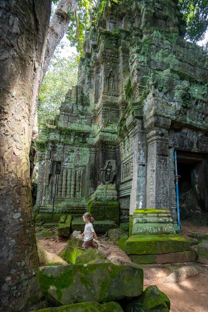 Our private tour of Angkor Wat was a world away from that long-ago bike ride. We explored the temples at our own pace with an air-conditioned van (a parent’s dream in the Cambodian heat) and an incredible guide who balanced deep historical knowledge with a warm, kid-friendly approach. He was also our personal photographer for the day, and we had a driver as well who greeted us after every exploration with cold towels and chilled water (always in a glass bottle – you won’t find plastic at Anantara Angkor).