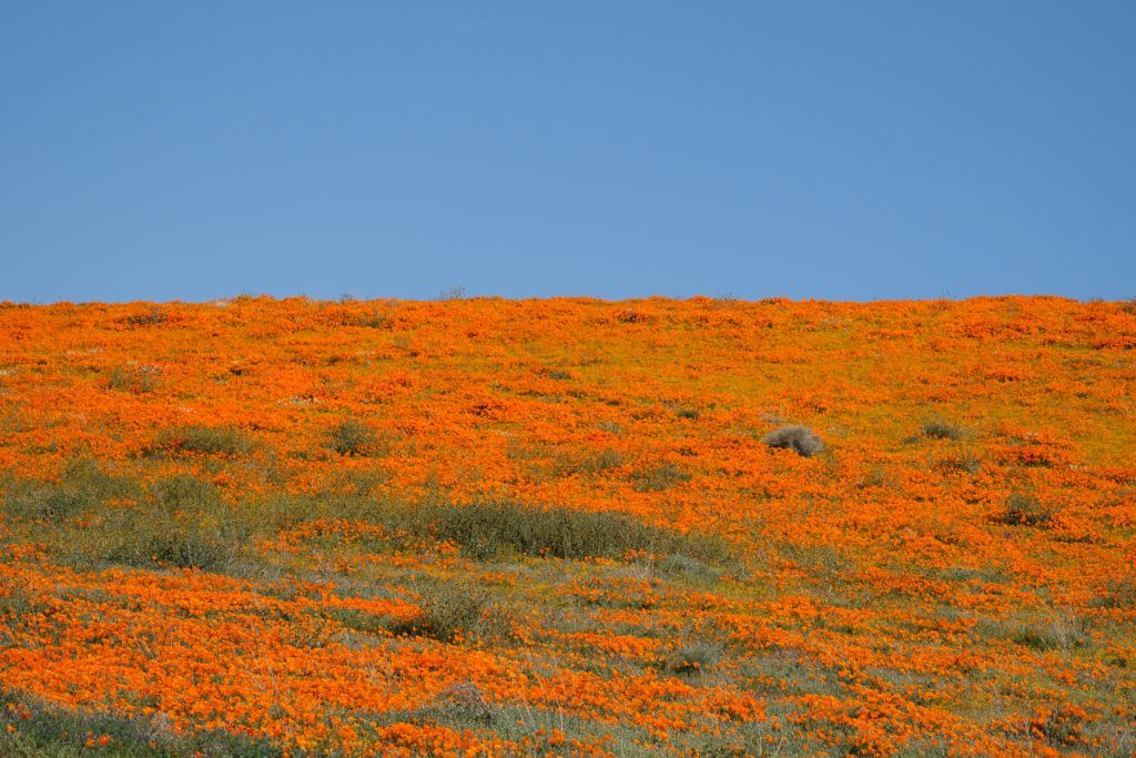 In Riverside County’s Lake Elsinore, poppies bloom on the hillsides east of I-15. Superblooms are astounding here, and during superbloom years, cars can be seen stopped all along the side of the freeway to take photos of the bright orange hillsides. The hills are part of Walker Canyon Ecological Reserve, which encompasses 490 acres of high desert. The number of flowers depends on the rains at the beginning of the year. Typically, the blooms open from February to April. While 2020 did not bring a superbloom, 2019 experienced one which covered 1,600 acres!