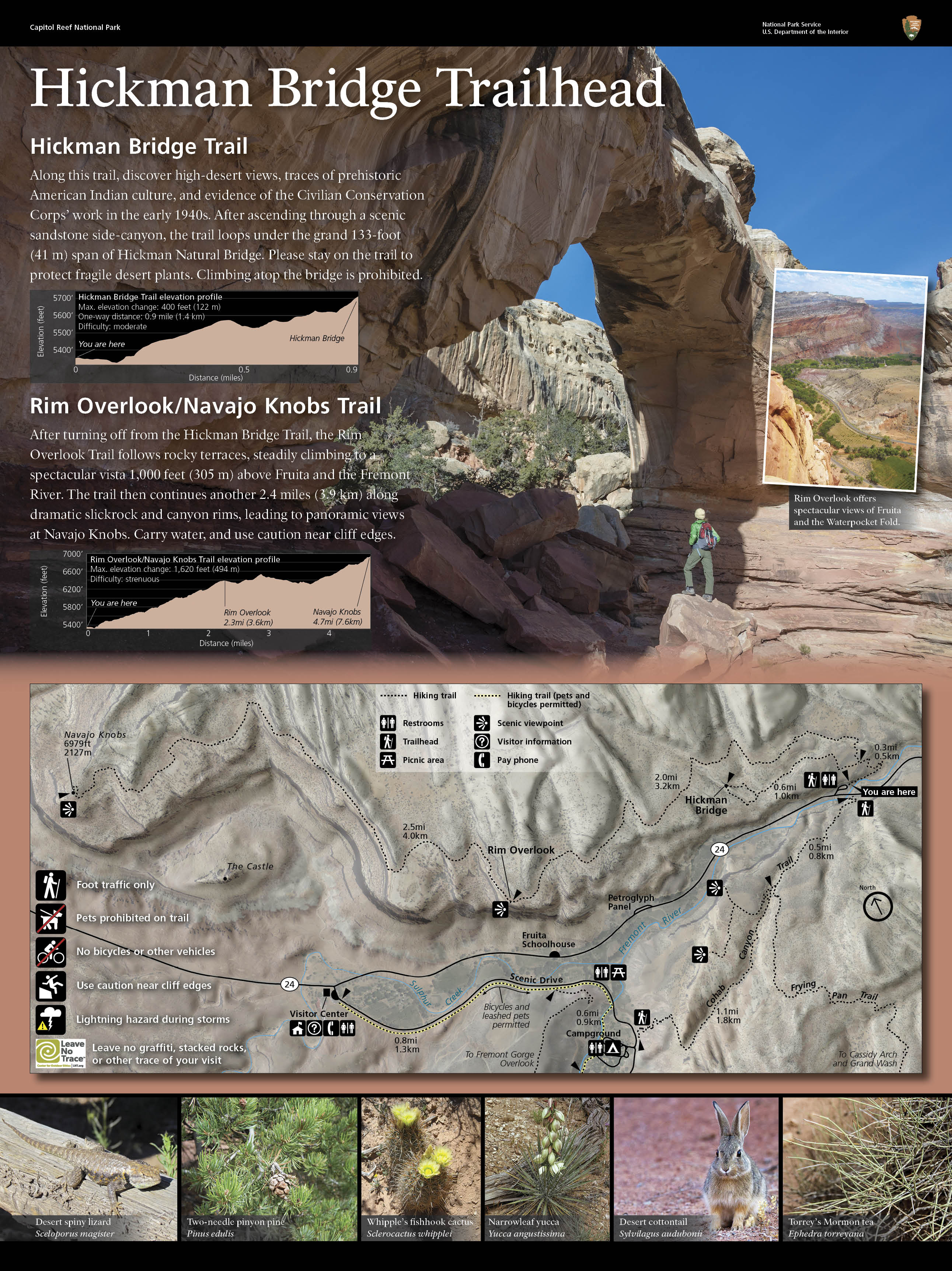 Also keep in mind that the starting elevation for Capitol Reef’s hiking trails is about 5,000 feet, so even easy trails might not feel that easy. Pack lots of water and sunscreen to offset the effects of the altitude and intense sun.